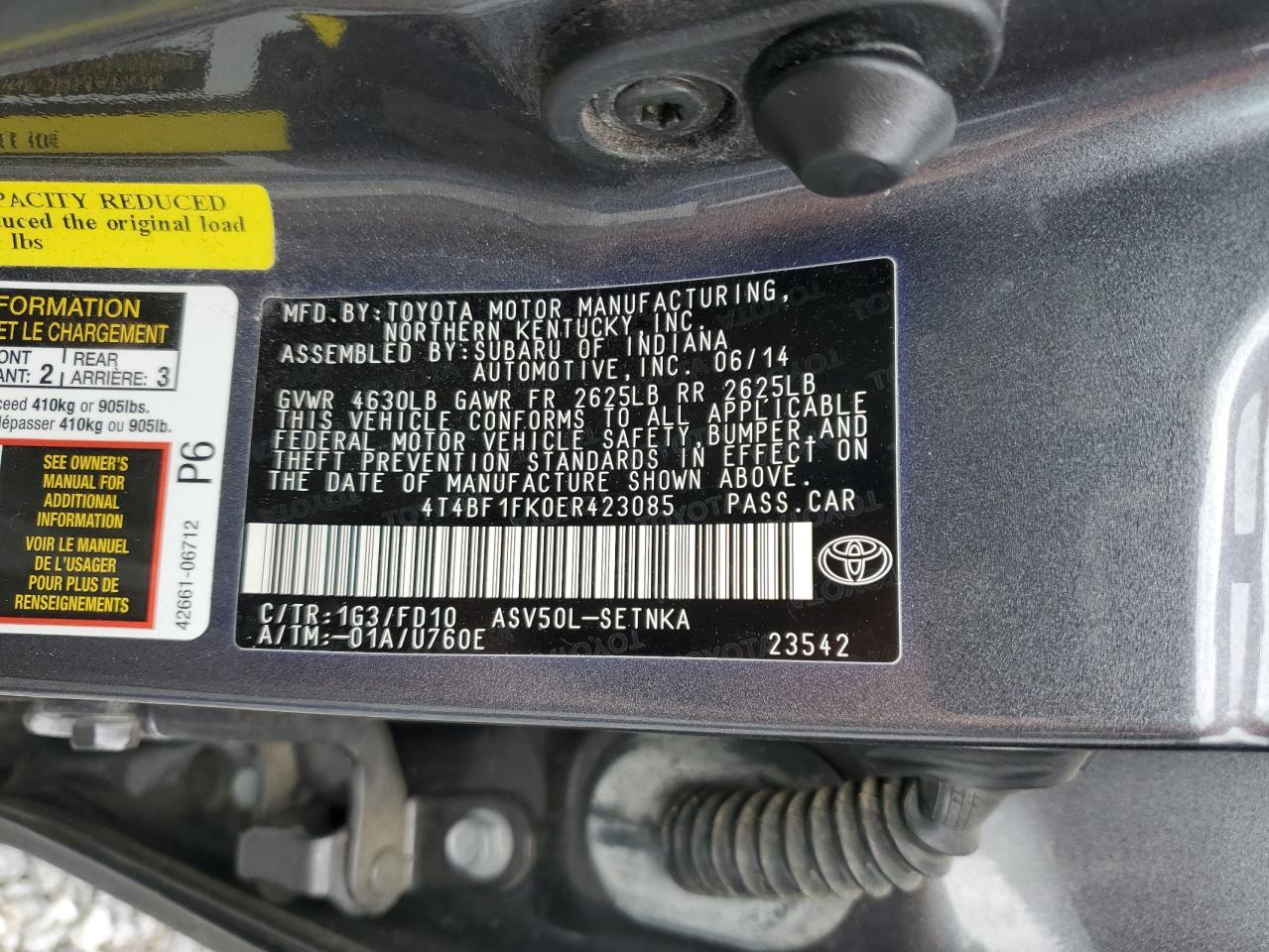 TOYOTA CAMRY 2.5 2014 г.в., (4T4BF1FK0ER423085) из США
