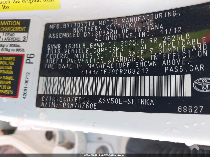 TOYOTA CAMRY 2.5 2012 г.в., Передний привод (4T4BF1FK9CR268212) из США