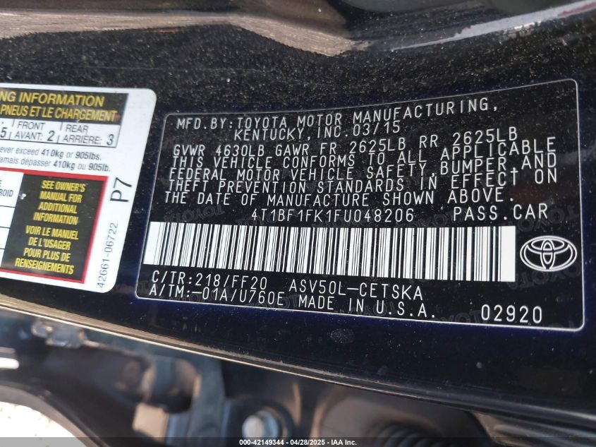 TOYOTA CAMRY 2.5 2015 г.в., Передний привод (4T1BF1FK1FU048206) из США