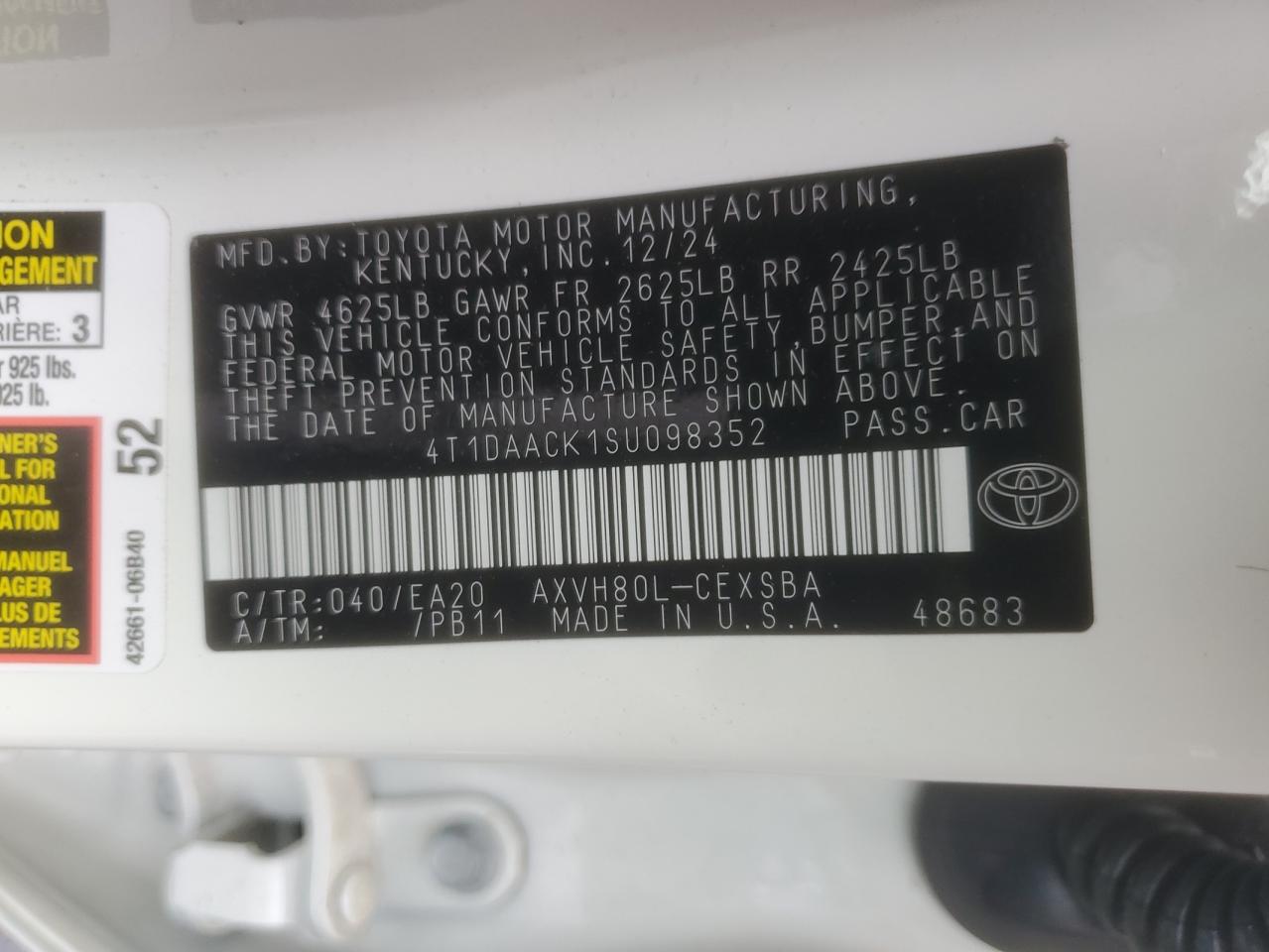 TOYOTA CAMRY 2.5 2025 г.в., (4T1DAACK1SU098352) из США