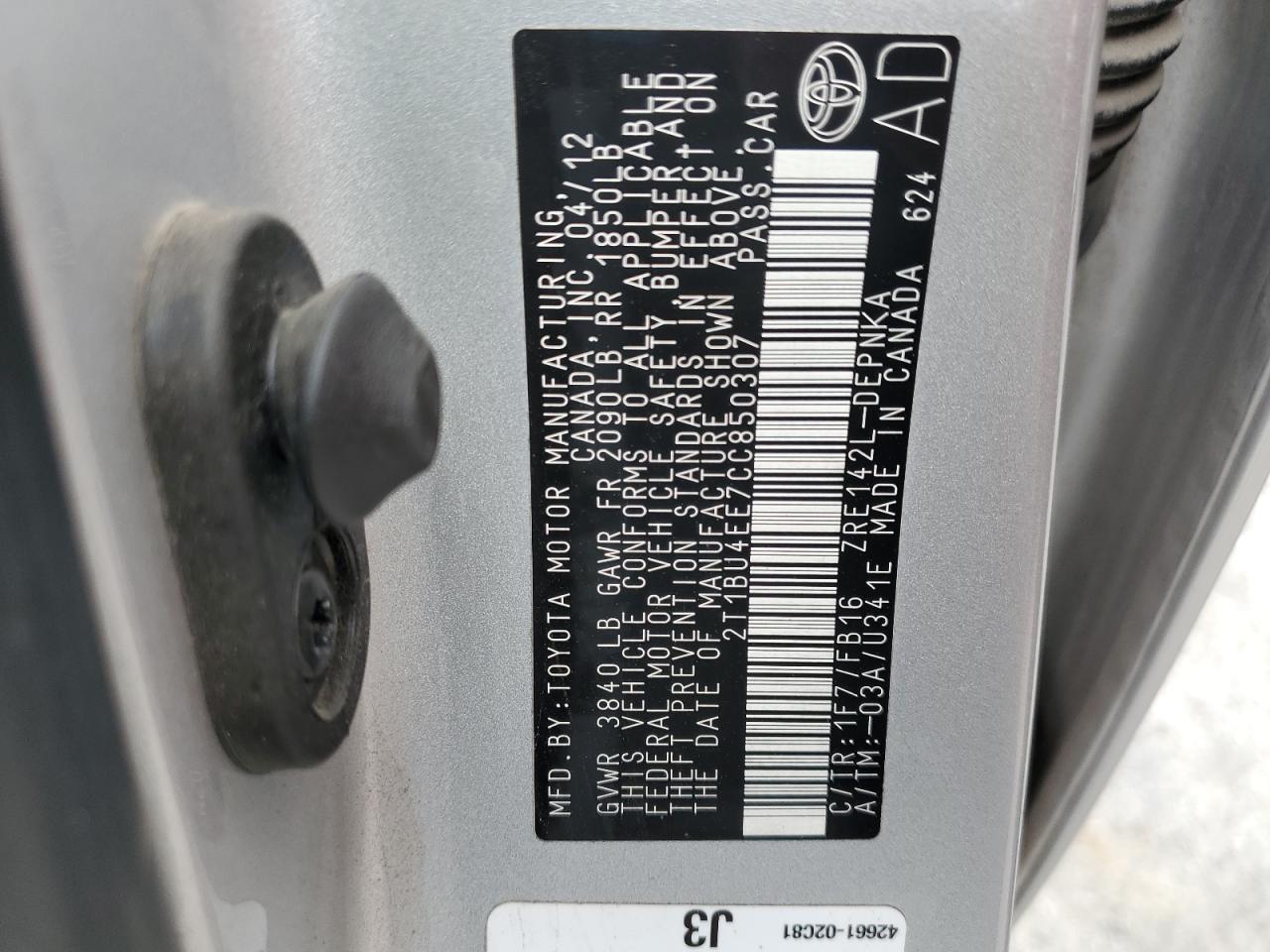 TOYOTA COROLLA 1.8 2012 г.в., (2T1BU4EE7CC850307) из США
