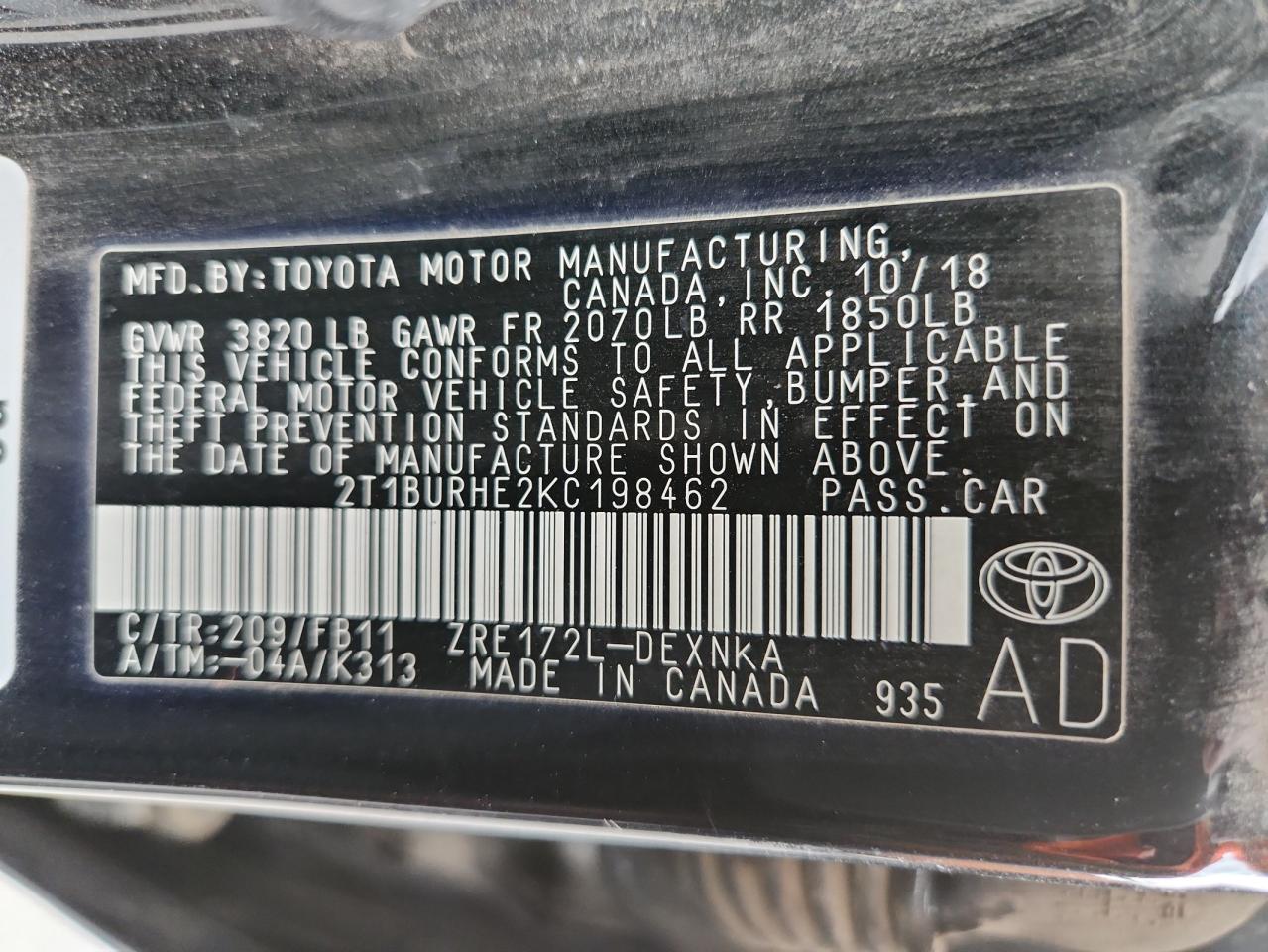 TOYOTA COROLLA 1.8 2019 г.в., (2T1BURHE2KC198462) из США