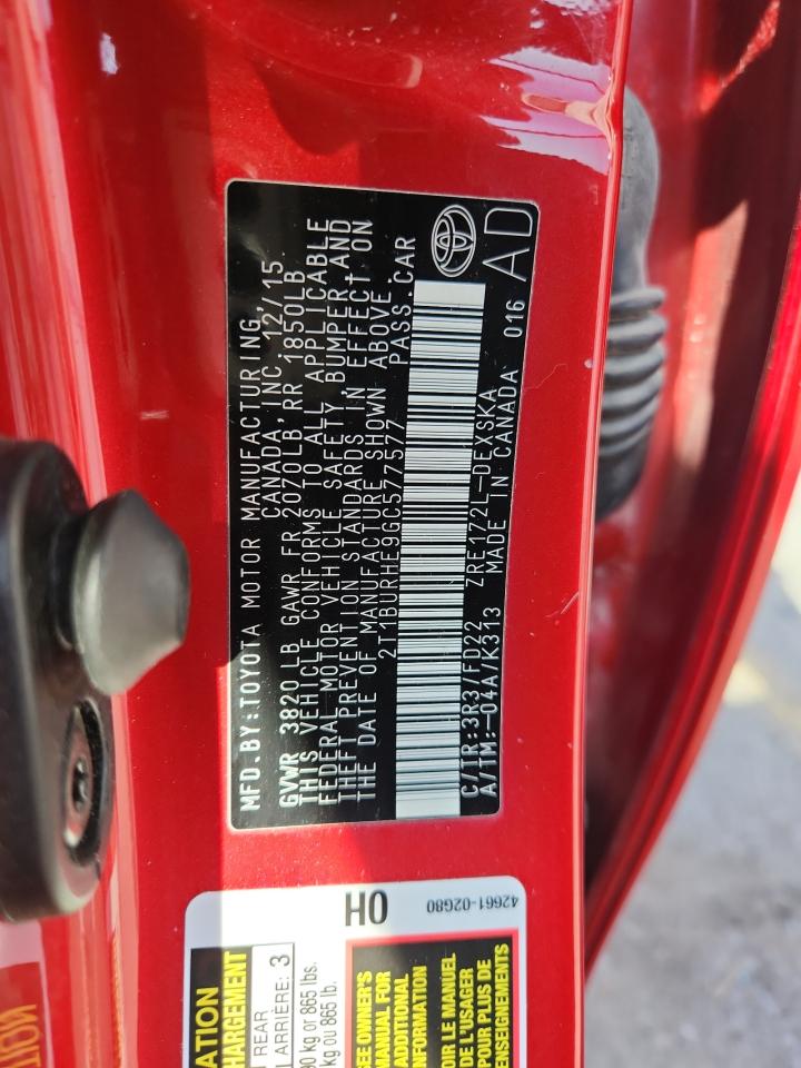 TOYOTA COROLLA 1.8 2016 г.в., (2T1BURHE9GC577577) из США