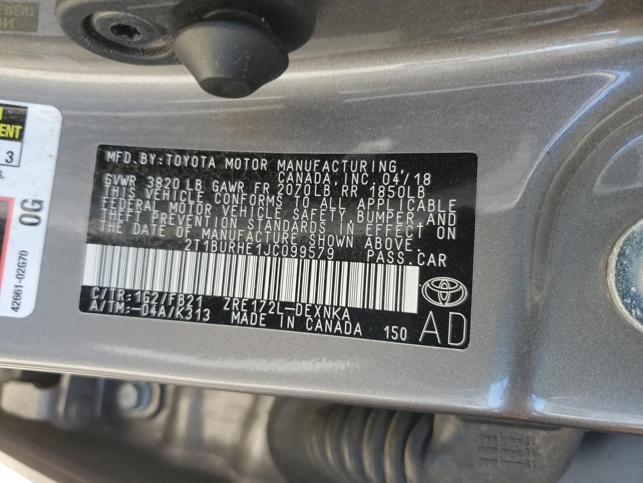 TOYOTA COROLLA 1.8 2018 г.в., (2T1BURHE1JC099579) из США