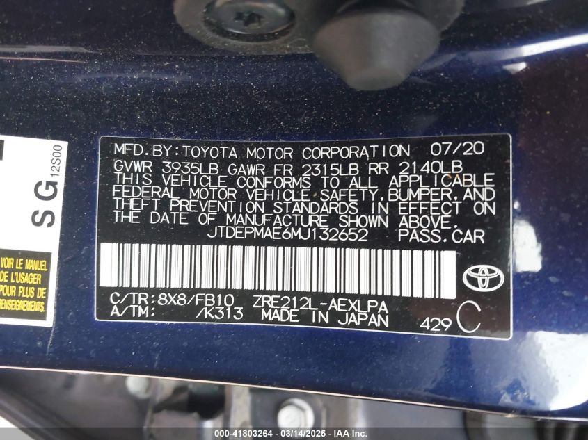 TOYOTA COROLLA 1.8 2021 г.в., Передний привод (JTDEPMAE6MJ132652) из США