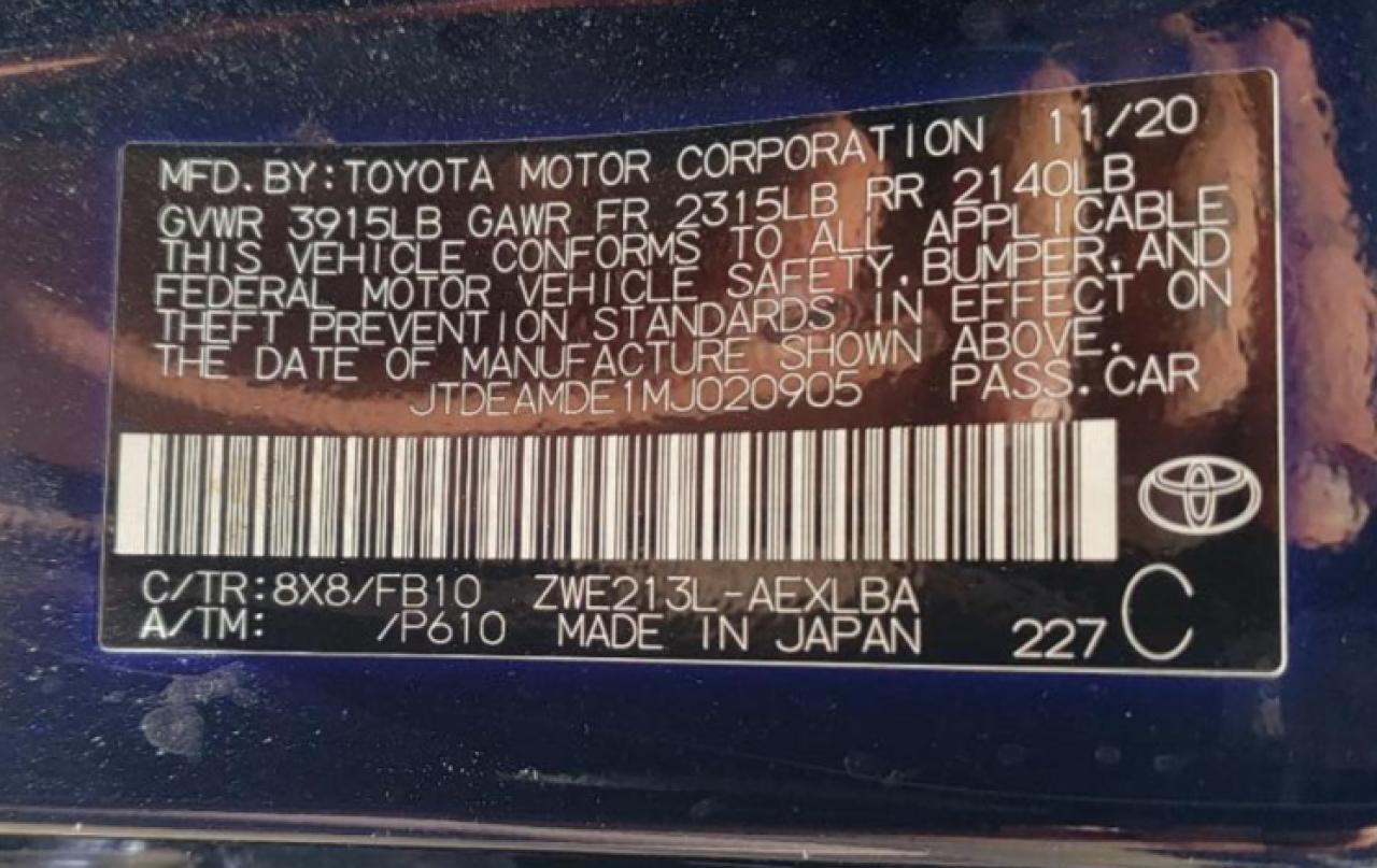 TOYOTA COROLLA 1.8 2021 г.в., (JTDEAMDE1MJ020905) из США