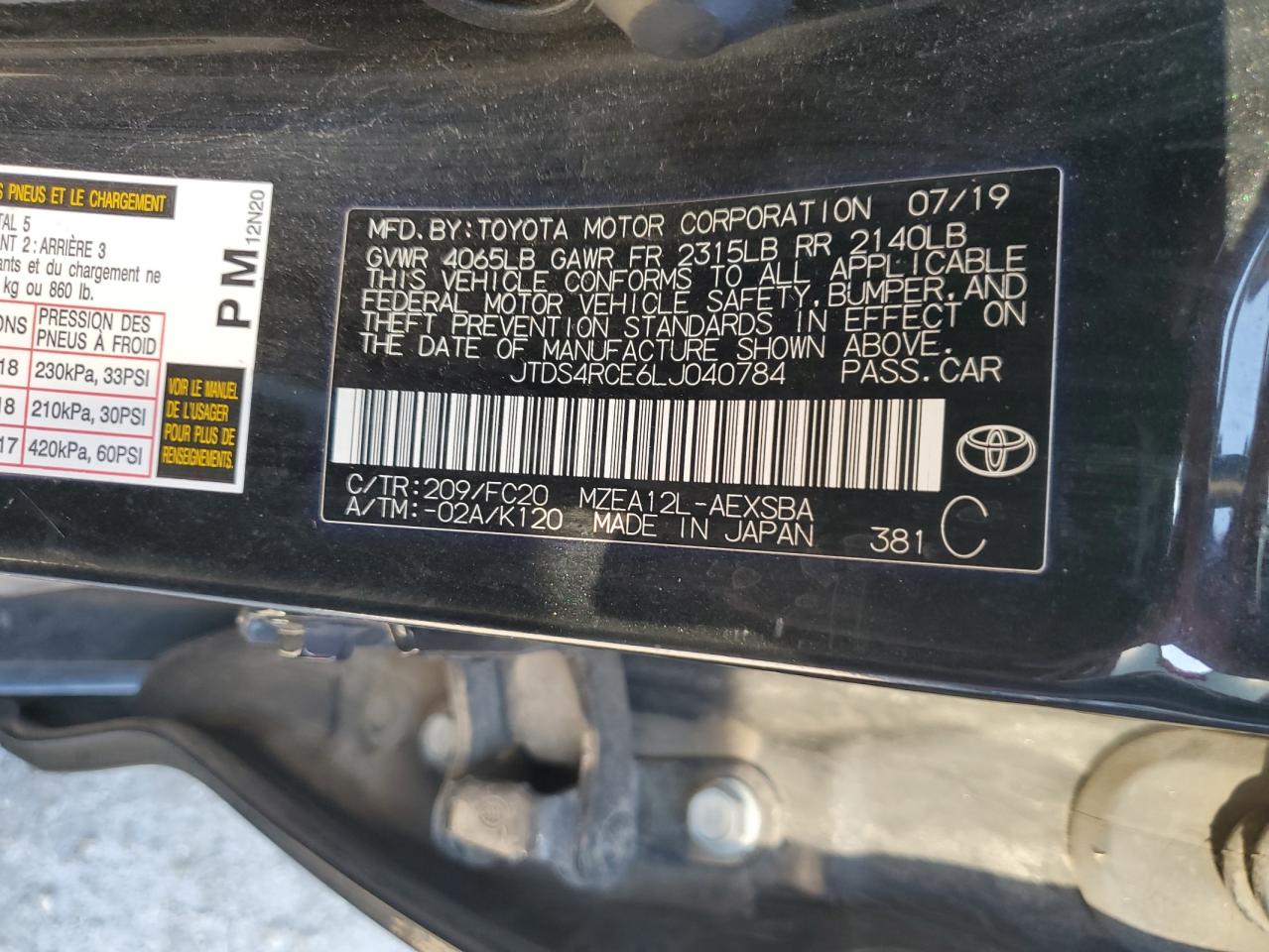 TOYOTA COROLLA 2.0 2020 г.в., (JTDS4RCE6LJ040784) из США