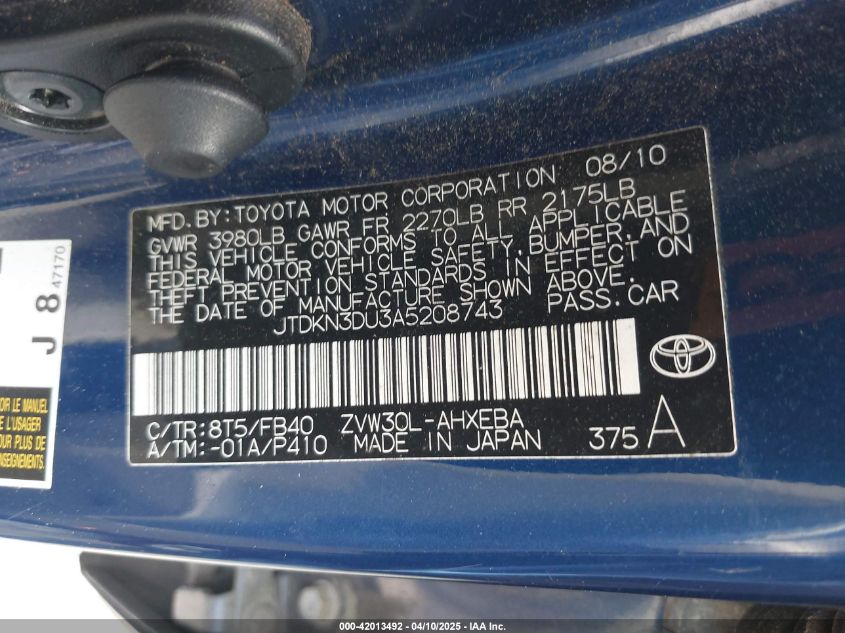 Цвет СинийЦилиндры 4Привод Передний приводVIN JTDKN3DU3A5208743Состояние Заводится и едет (проверено)Повреждение ЗадняяДата аукциона 2025-11-04