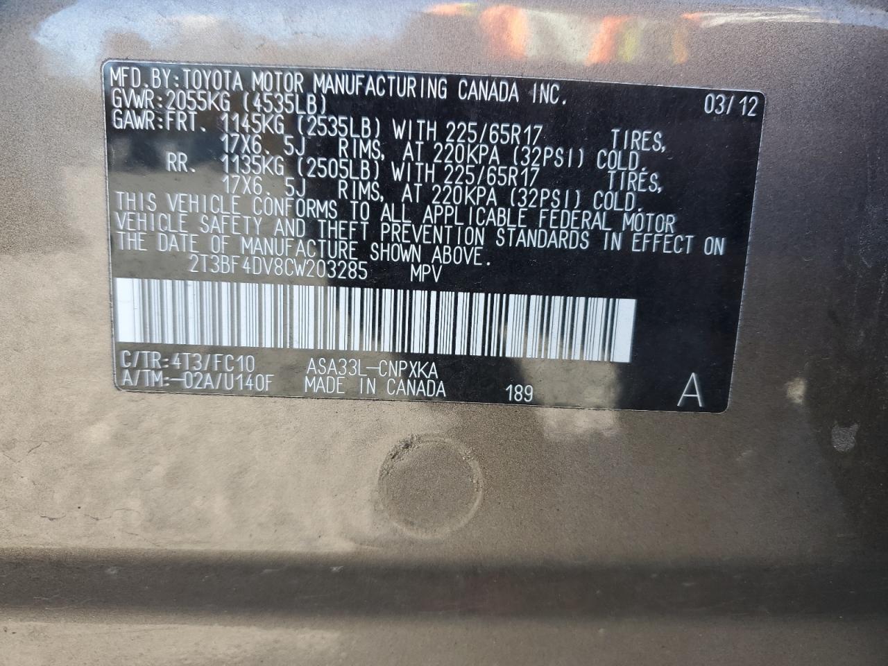 Цвет ЗагарЦилиндры 4Привод Полный приводVIN 2T3BF4DV8CW203285Состояние Заводится и едет (проверено)Повреждение Передняя или задняяДата аукциона 2025-11-05