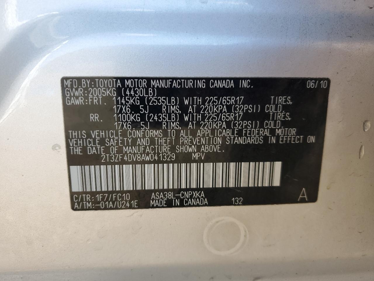 TOYOTA RAV4 2.5 2010 г.в., (2T3ZF4DV8AW041329) из США
