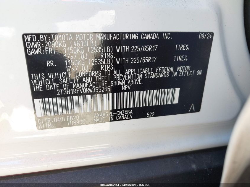 TOYOTA RAV4 2.5 2024 г.в., Передний привод (2T3H1RFV0RW355265) из США