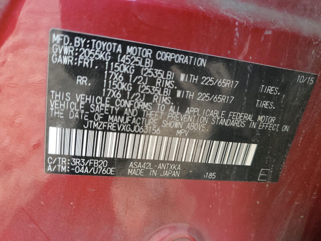 Цвет КрасныйЦилиндры 4VIN JTMZFREVXGJ063156Состояние НеизвестноПовреждение Передняя или задняя