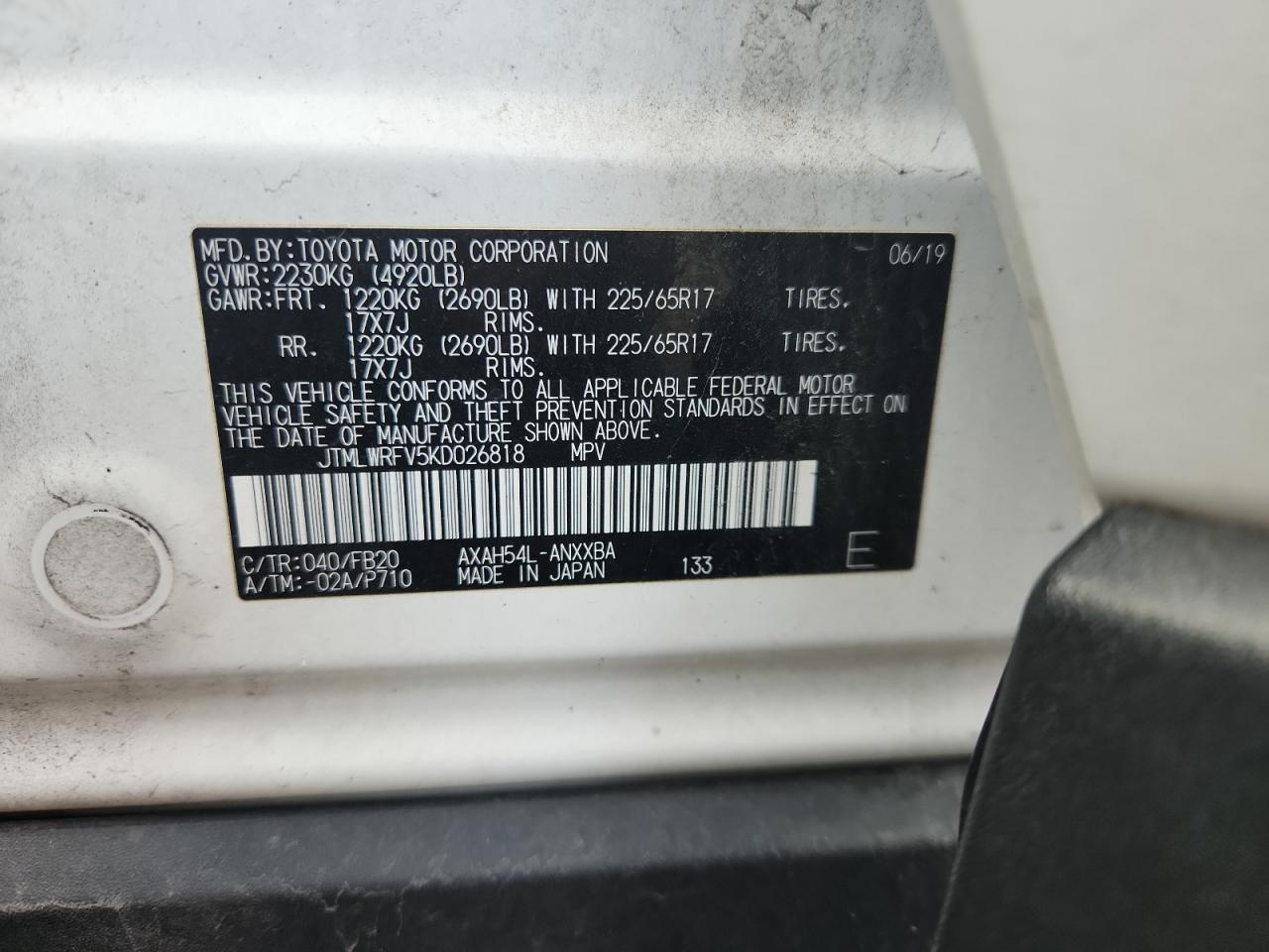 TOYOTA RAV4 2.5 2019 г.в., Полный привод (JTMLWRFV5KD026818) из США