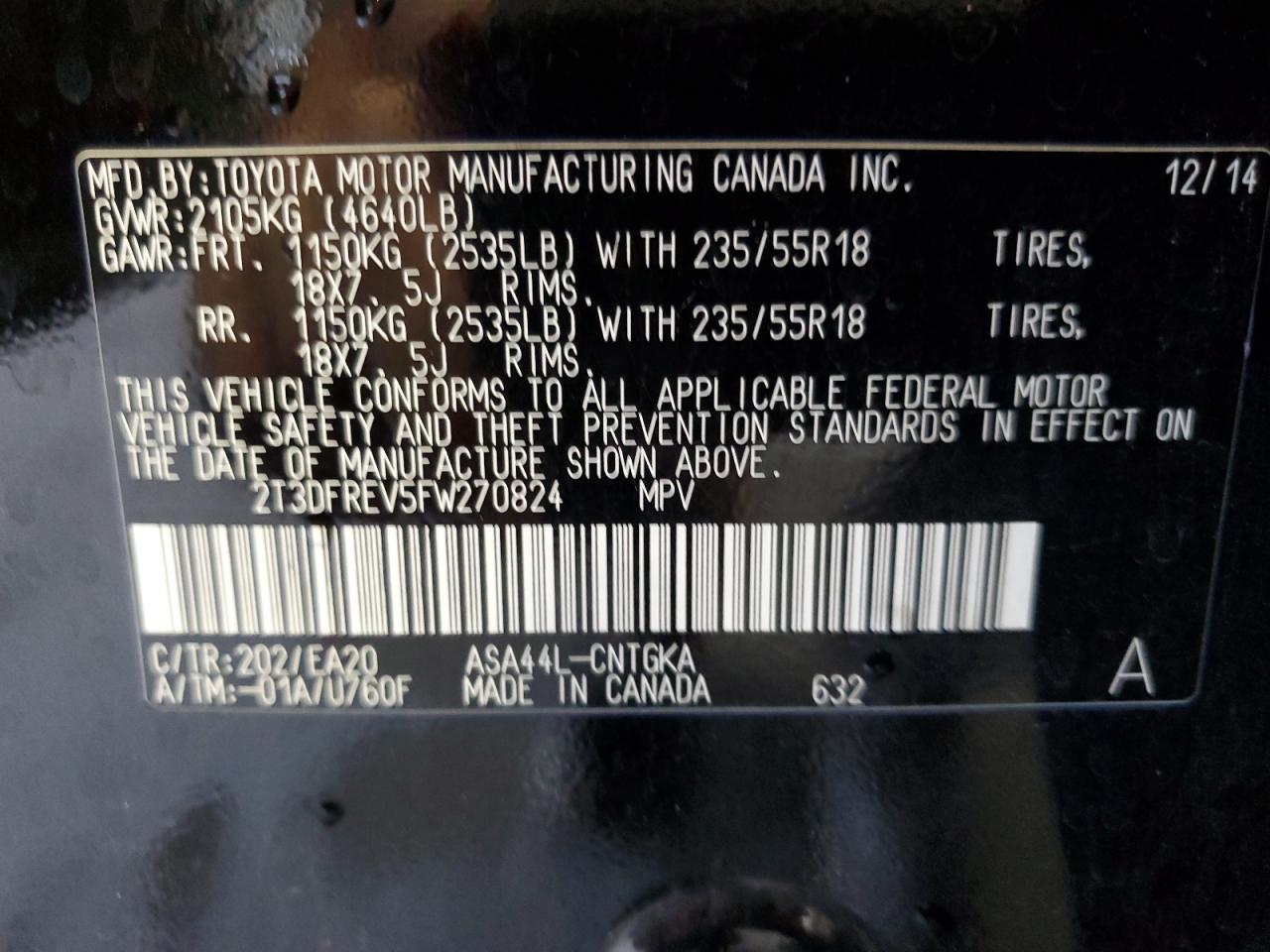 TOYOTA RAV4 2.5 2015 г.в., Полный привод (2T3DFREV5FW270824) из США