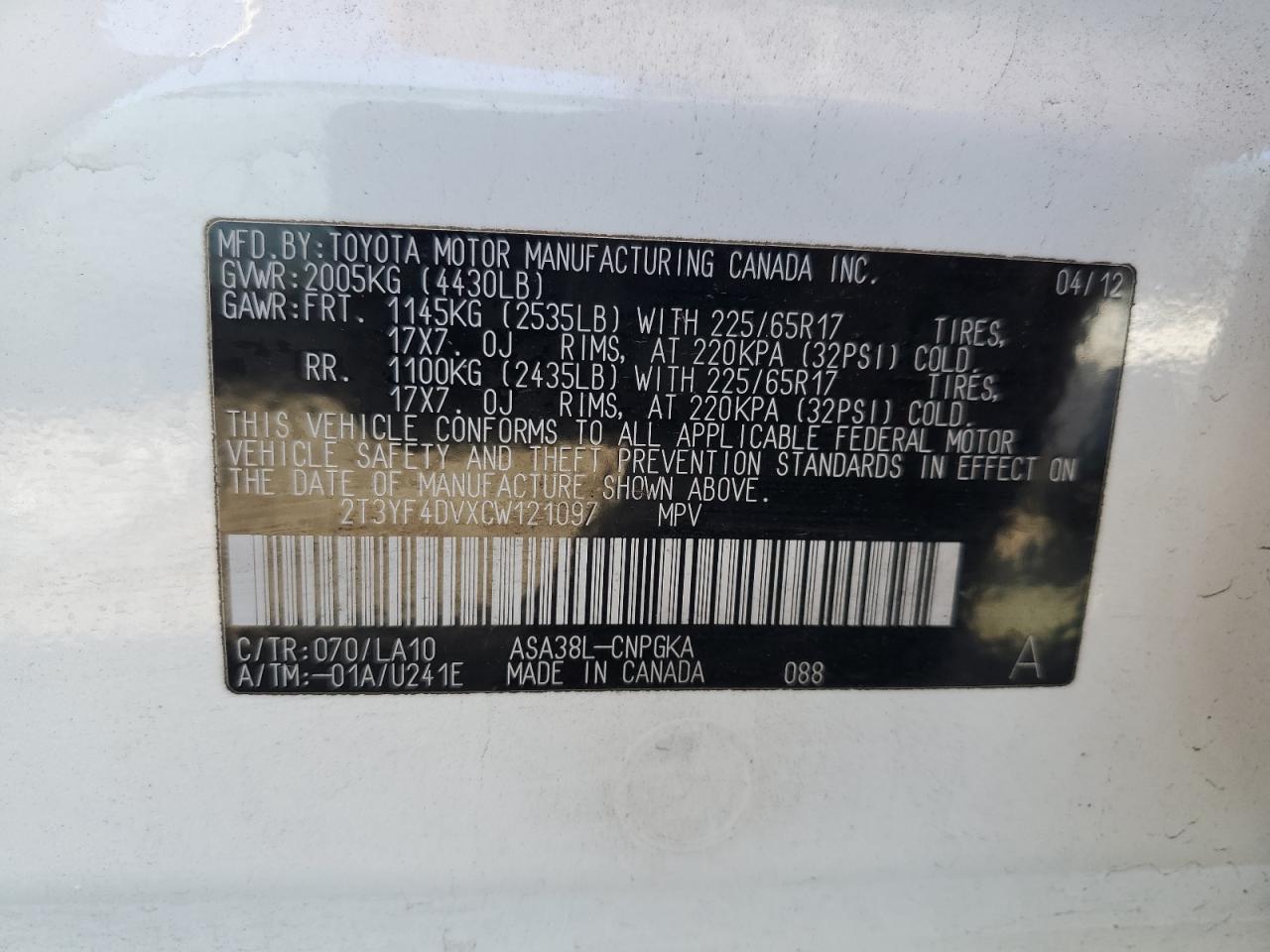TOYOTA RAV4 2.5 2012 г.в., (2T3YF4DVXCW121097) из США