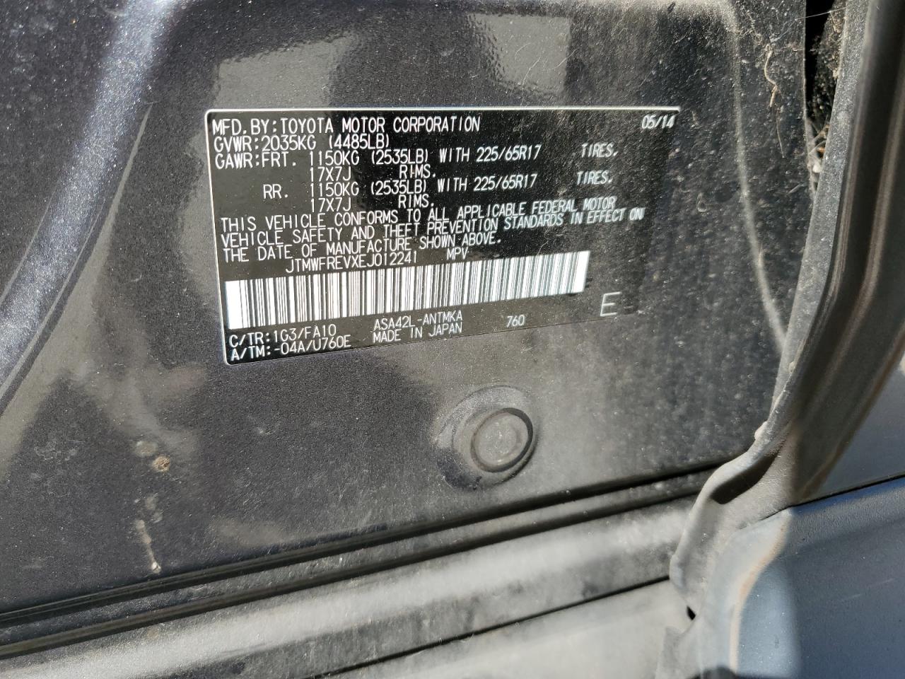 Цвет СерыйЦилиндры 4VIN JTMWFREVXEJ012241Состояние Заводится и едет (проверено)Повреждение Передняя или задняяДата аукциона 2025-11-04
