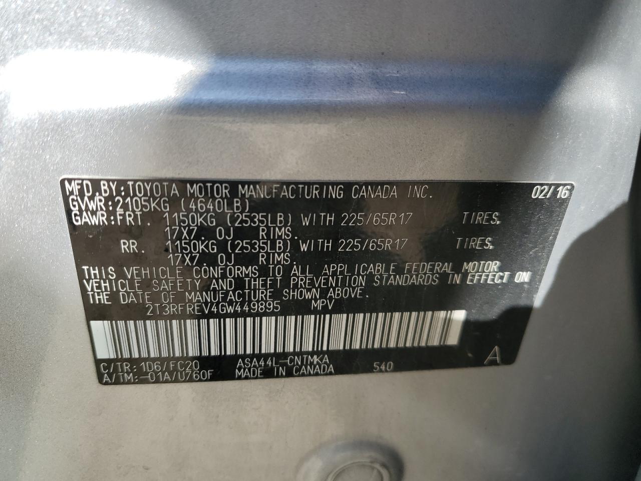 TOYOTA RAV4 2.5 2016 г.в., Полный привод (2T3RFREV4GW449895) из США