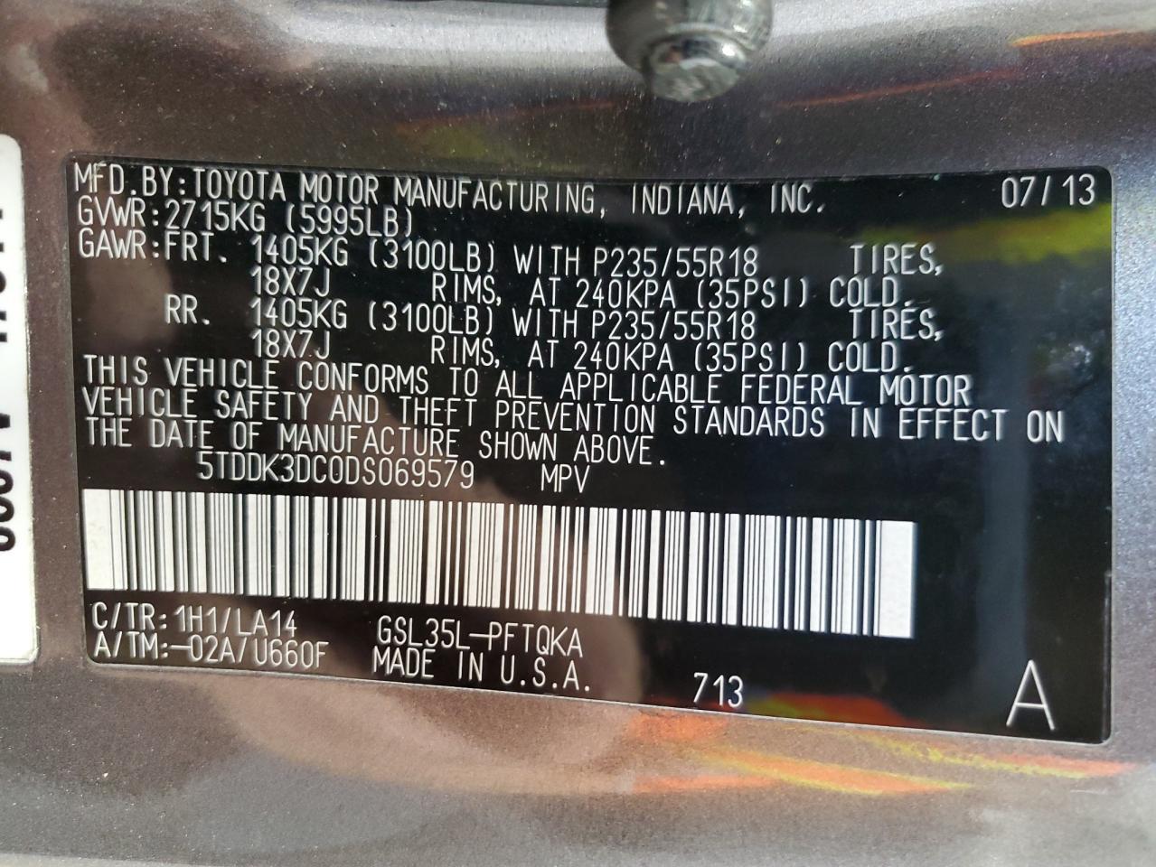 TOYOTA SIENNA 3.5 2013 г.в., Полный привод (5TDDK3DC0DS069579) из США