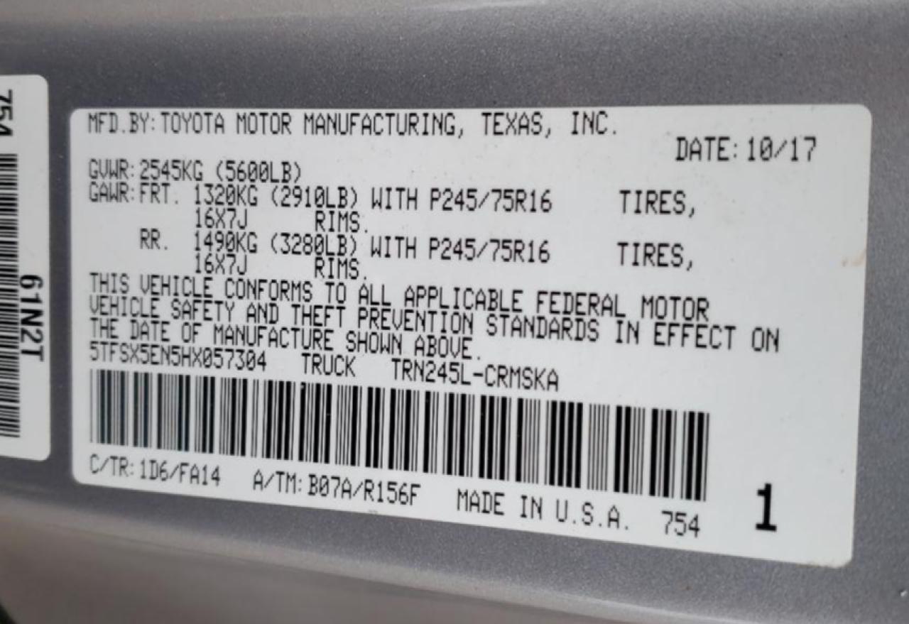 TOYOTA TACOMA 2.7 2017 г.в., 4x4 с задним приводом (5TFSX5EN5HX057304) из США
