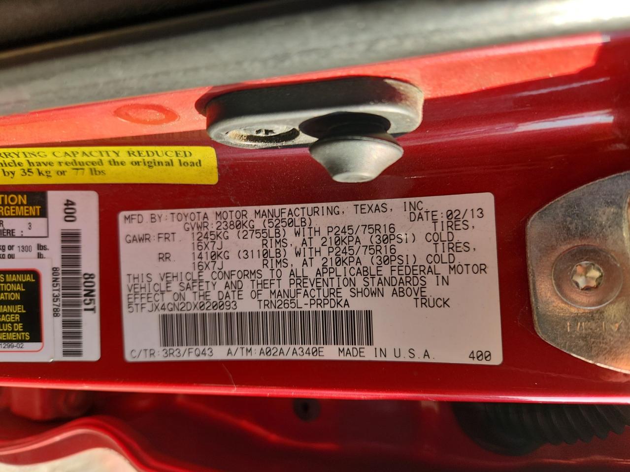 Цвет КрасныйЦилиндры 4Привод Задний приводVIN 5TFJX4GN2DX020093Состояние НеизвестноПовреждение Передняя или задняяДата аукциона 2025-11-24