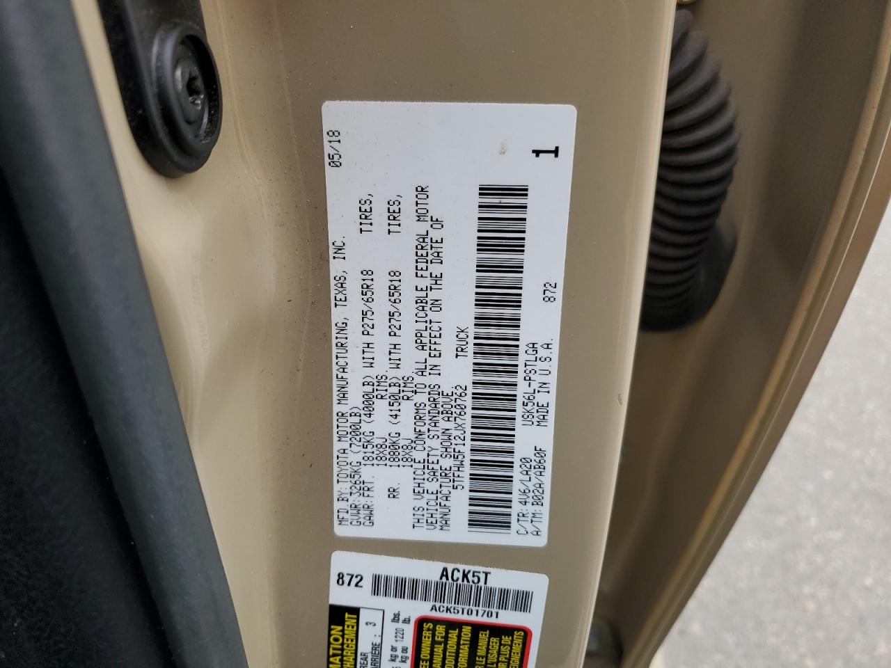 TOYOTA TUNDRA 5.7 2018 г.в., 4x4 с задним приводом (5TFHW5F12JX760762) из США