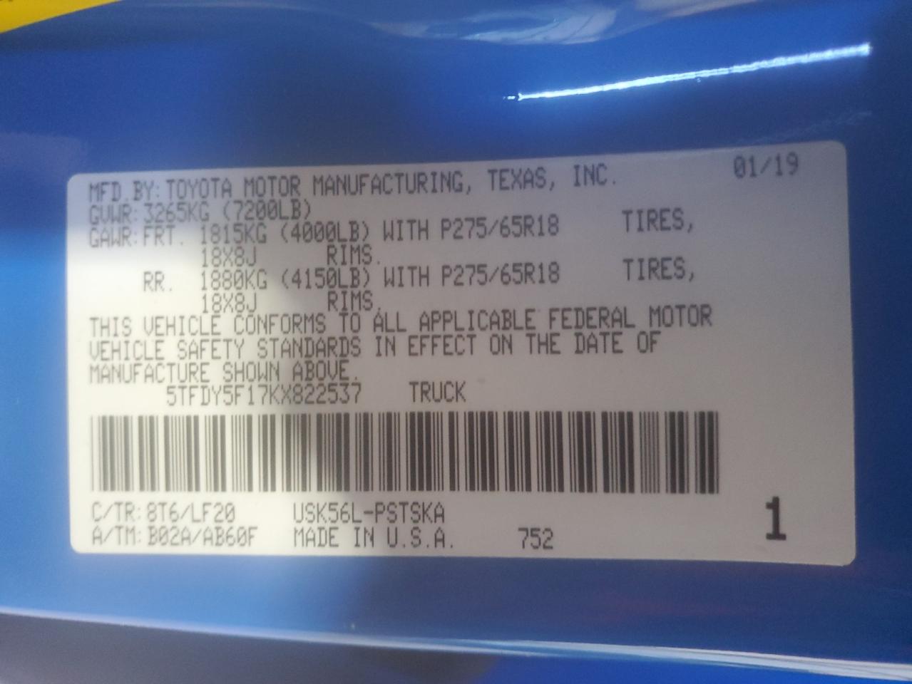 TOYOTA TUNDRA 5.7 2019 г.в., 4x4 с задним приводом (5TFDY5F17KX822537) из США