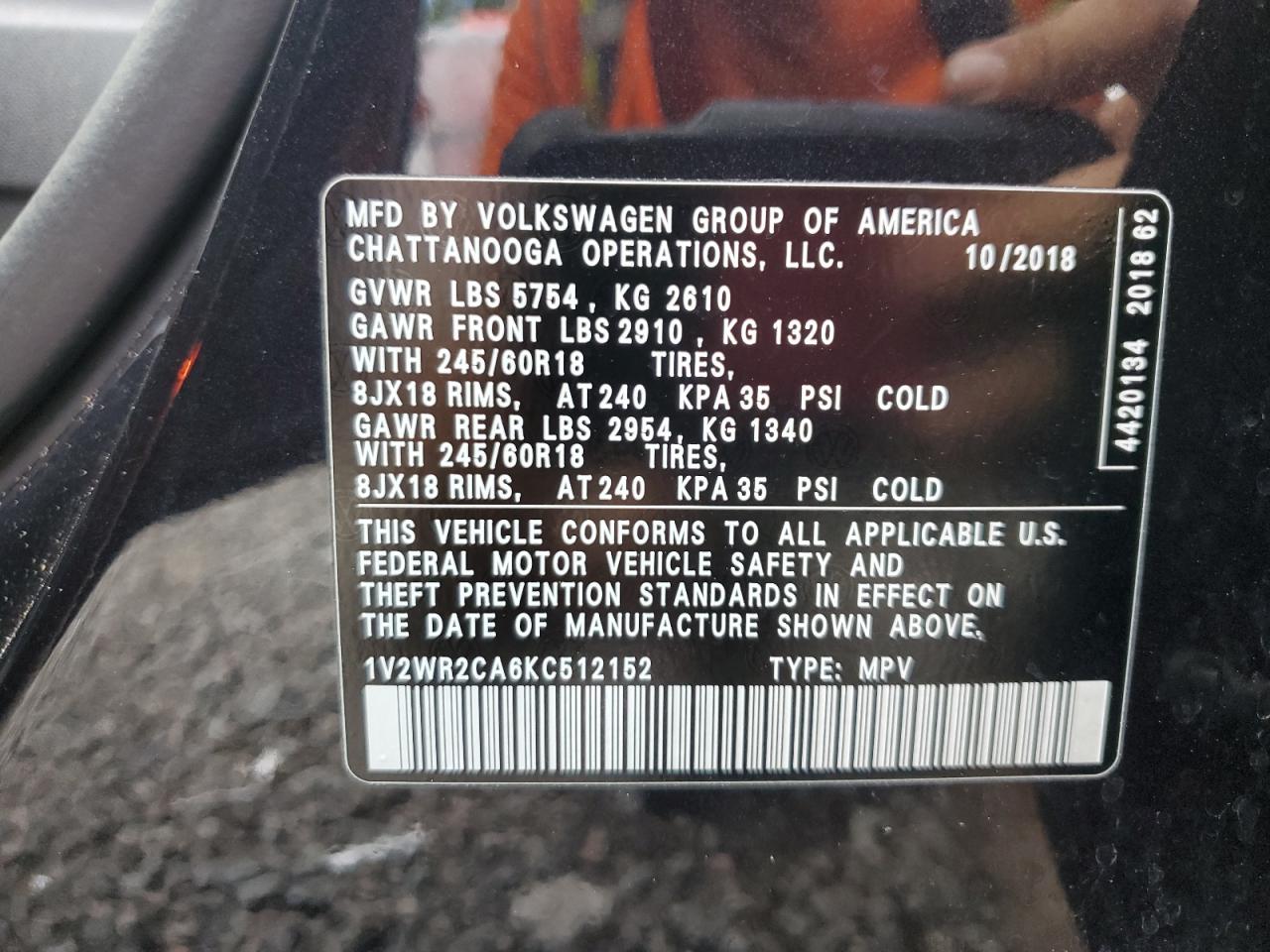 VOLKSWAGEN ATLAS 3.6 2019 г.в., (1V2WR2CA6KC512152) из США