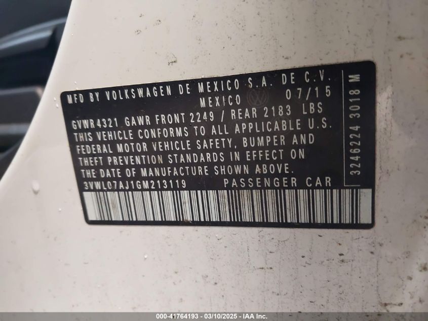 VOLKSWAGEN JETTA 1.8 2016 г.в., Передний привод (3VWL07AJ1GM213119) из США