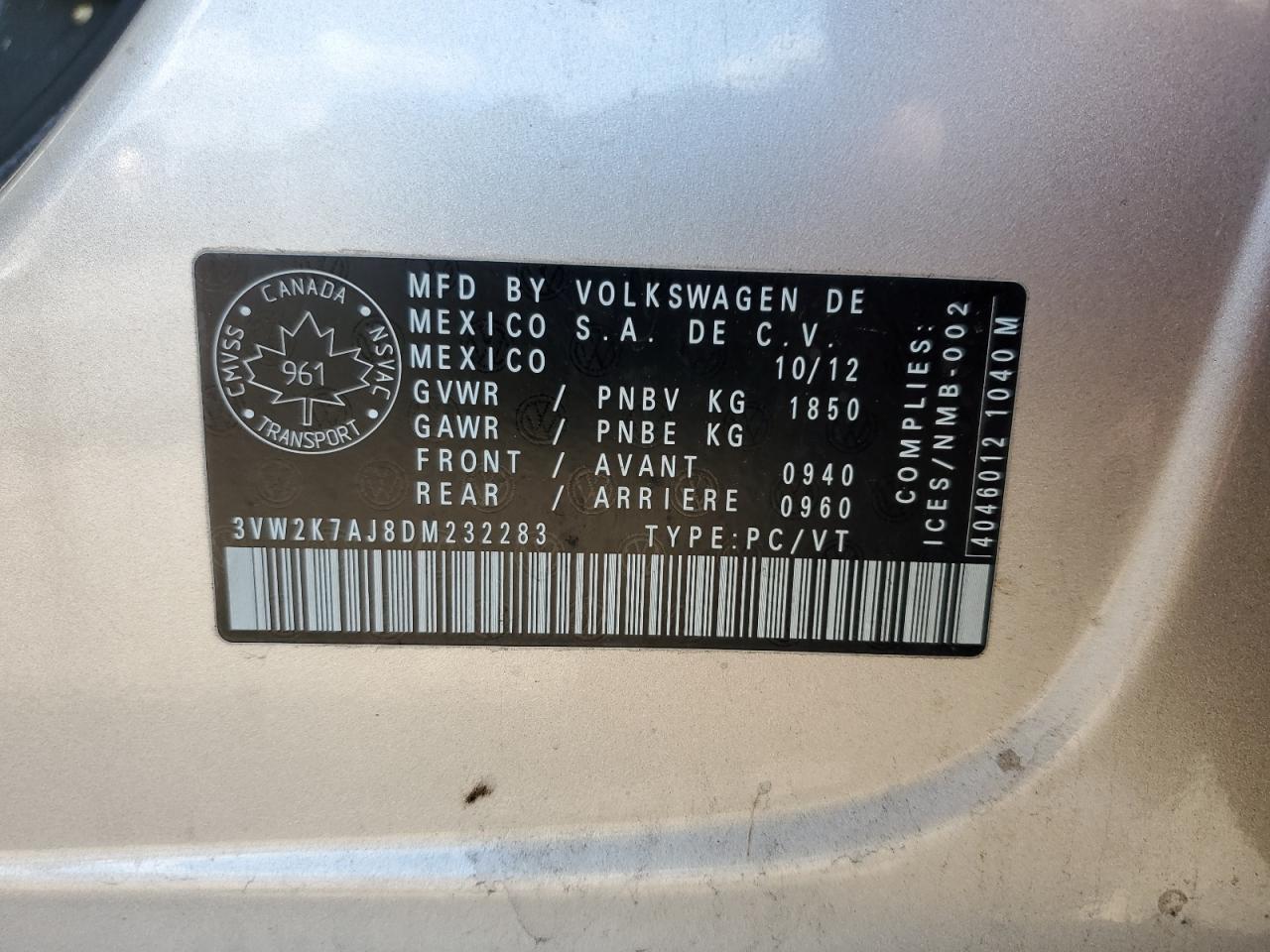 VOLKSWAGEN JETTA 2.0 2013 г.в., (3VW2K7AJ8DM232283) из США