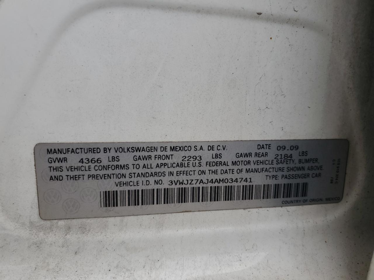 VOLKSWAGEN JETTA 2.5 2010 г.в., (3VWJZ7AJ4AM034741) из США