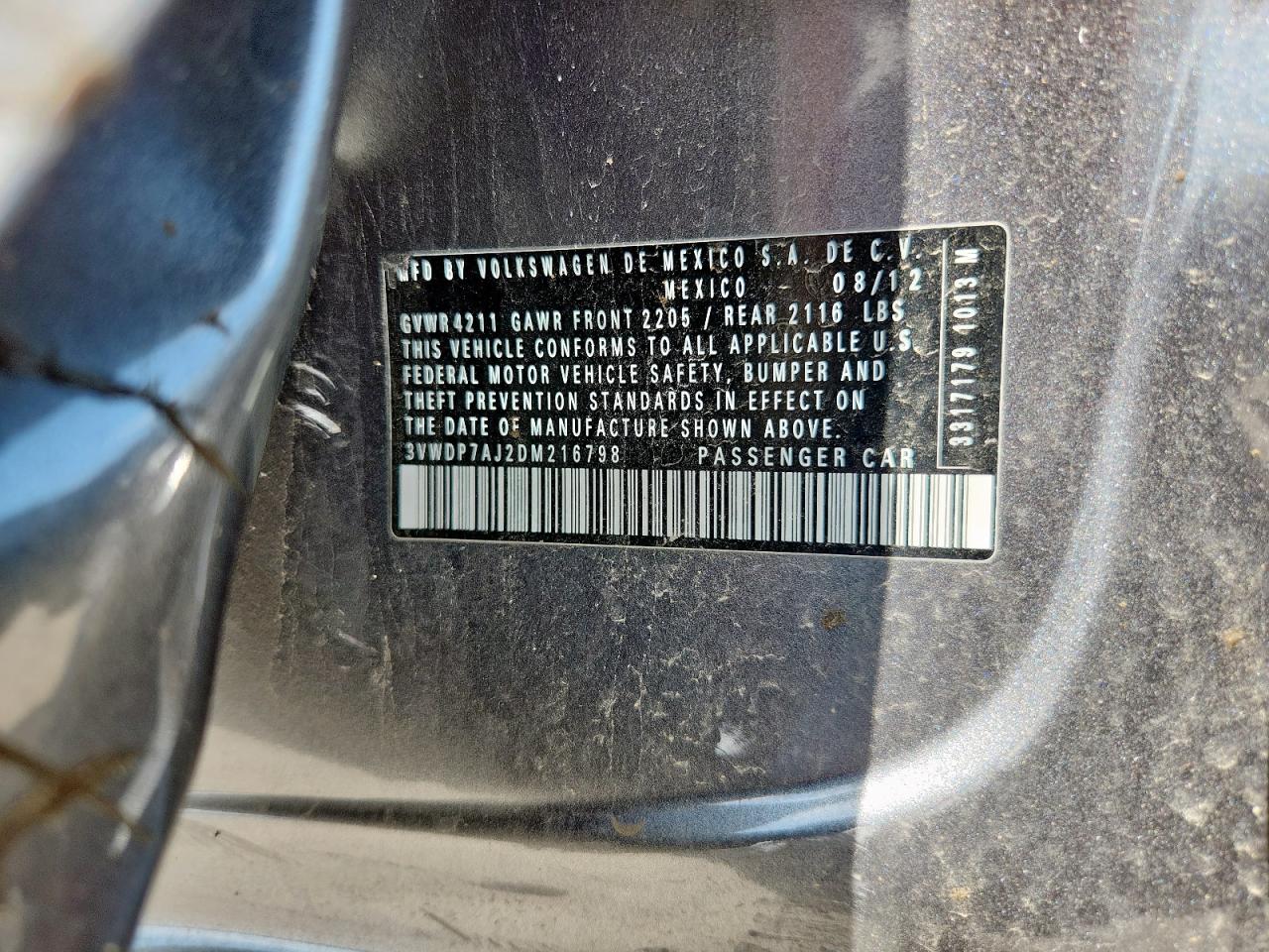 VOLKSWAGEN JETTA 2.5 2013 г.в., (3VWDP7AJ2DM216798) из США