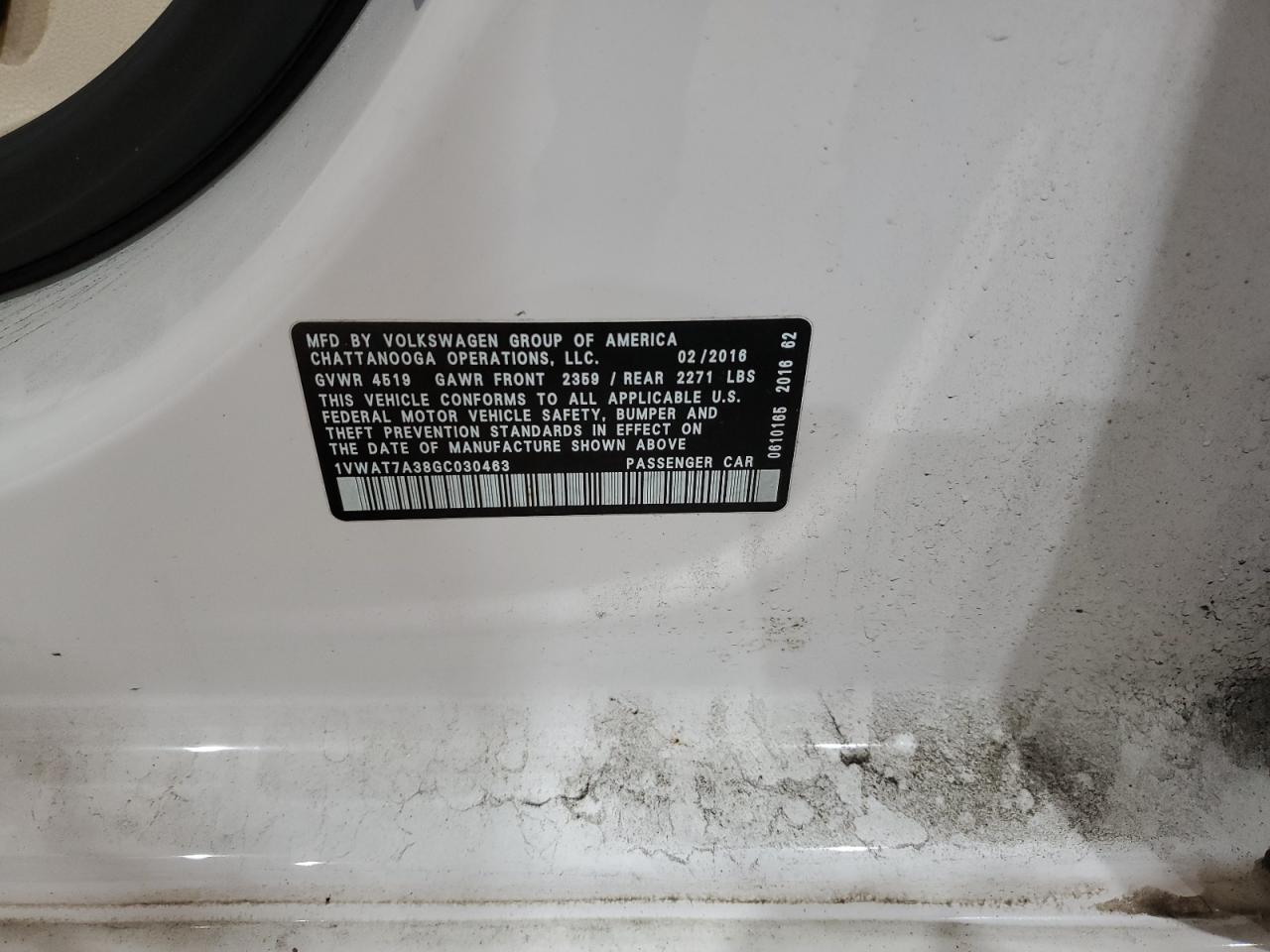 VOLKSWAGEN PASSAT 1.8 2016 г.в., (1VWAT7A38GC030463) из США