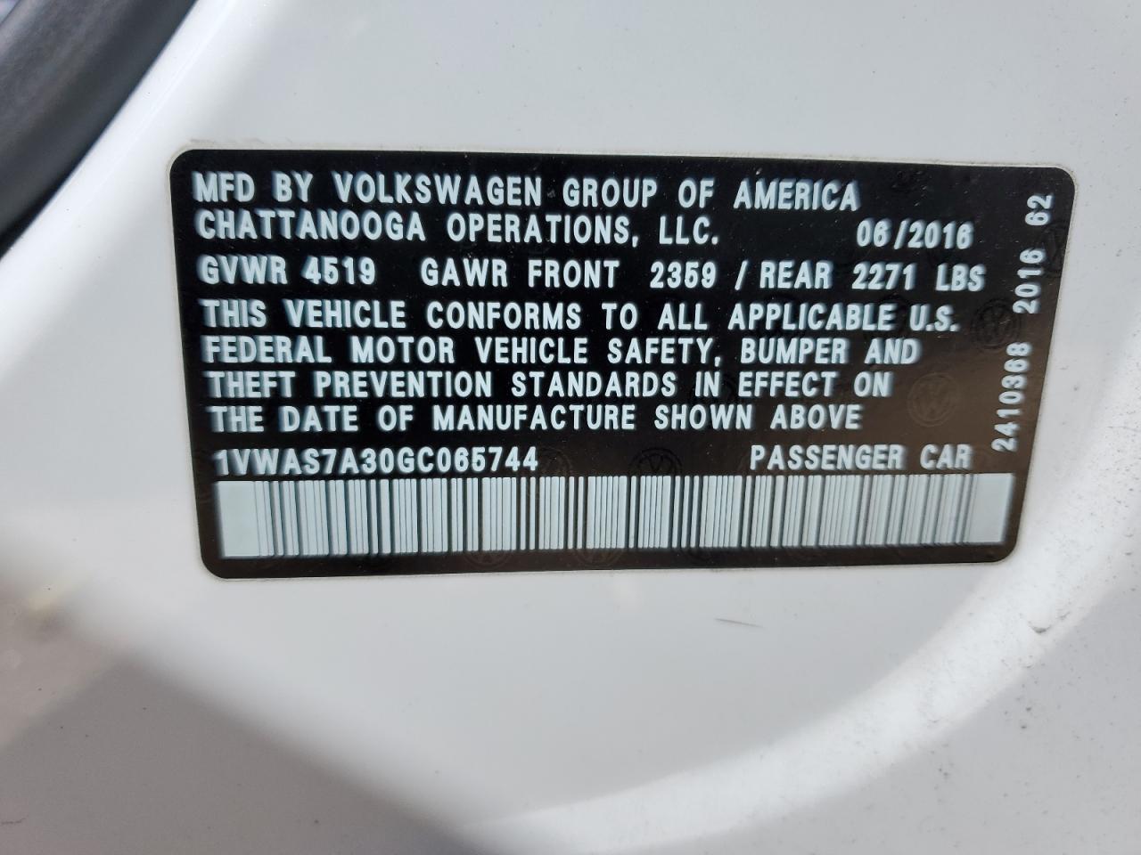 VOLKSWAGEN PASSAT 1.8 2016 г.в., (1VWAS7A30GC065744) из США
