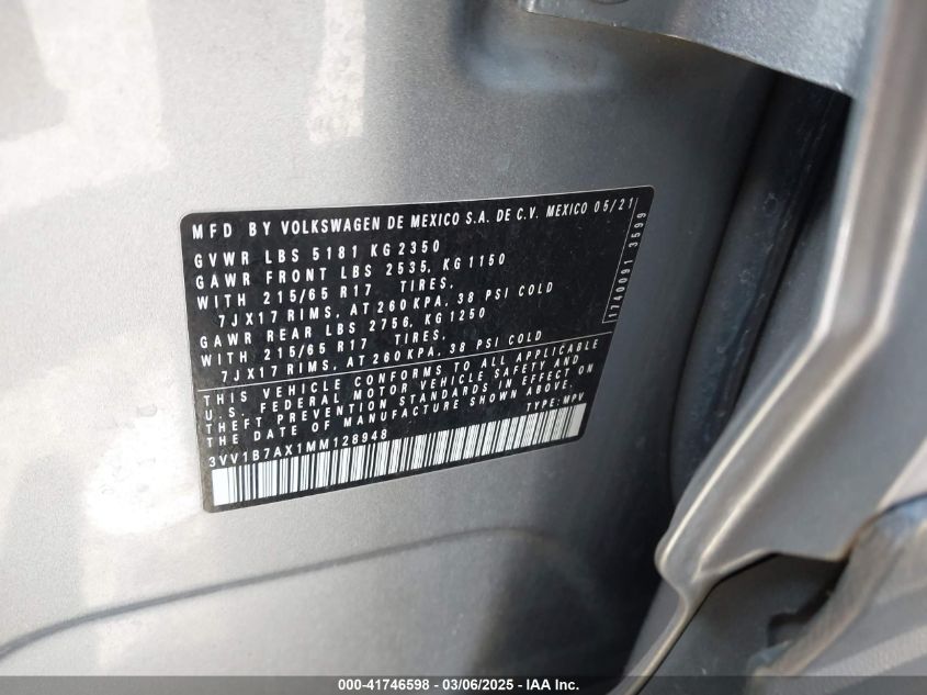 VOLKSWAGEN TIGUAN 2.0 2021 г.в., Передний привод (3VV1B7AX1MM128948) из США