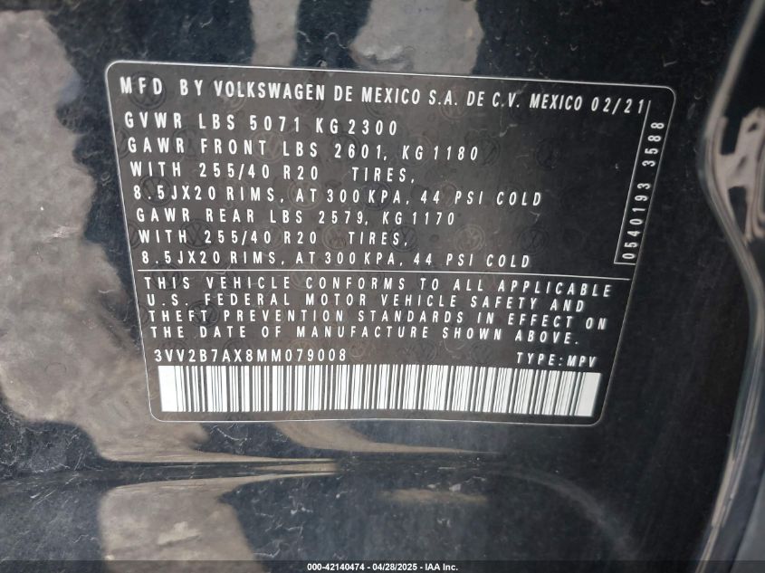 VOLKSWAGEN TIGUAN 2.0 2021 г.в., Полный привод (3VV2B7AX8MM079008) из США