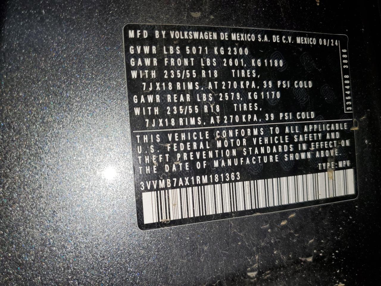 VOLKSWAGEN TIGUAN 2.0 2024 г.в., Полный привод (3VVMB7AX1RM181363) из США