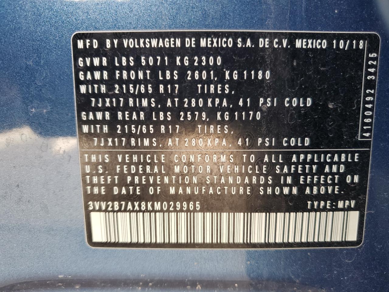 VOLKSWAGEN TIGUAN 2.0 2019 г.в., Полный привод (3VV2B7AX8KM029965) из США