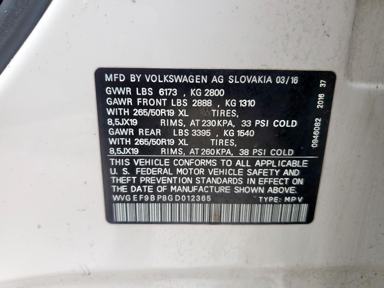 Цвет БелыйЦилиндры 6Привод Полный приводVIN WVGEF9BP8GD012365Состояние НеизвестноПовреждение Задняя