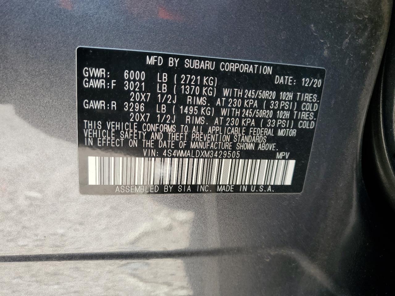 SUBARU ASCENT 2.4 2021 р.в., Повний привід (4S4WMALDXM3429505) з США