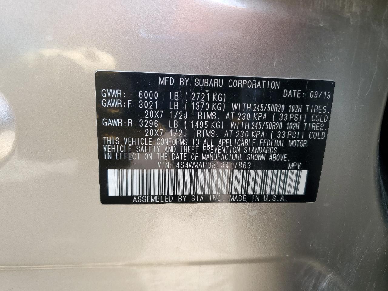 SUBARU ASCENT 2.4 2020 р.в., Повний привід (4S4WMAPD8L3417863) з США