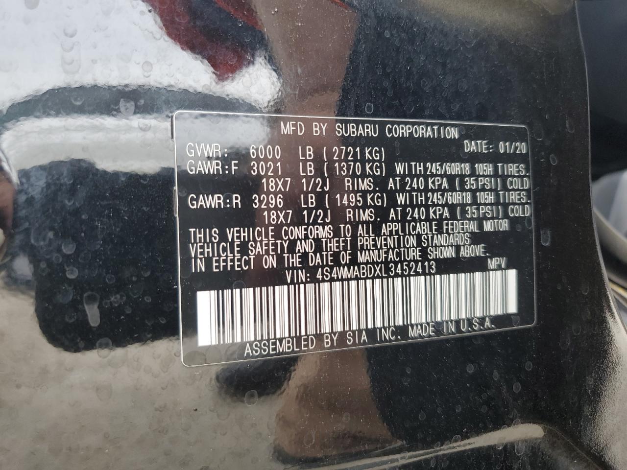 SUBARU ASCENT 2.4 2020 р.в., Повний привід (4S4WMABDXL3452413) з США