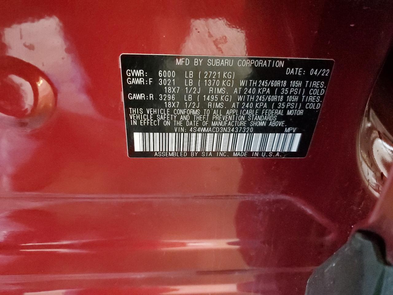 SUBARU ASCENT 2.4 2022 р.в., Повний привід (4S4WMACD3N3437320) з США