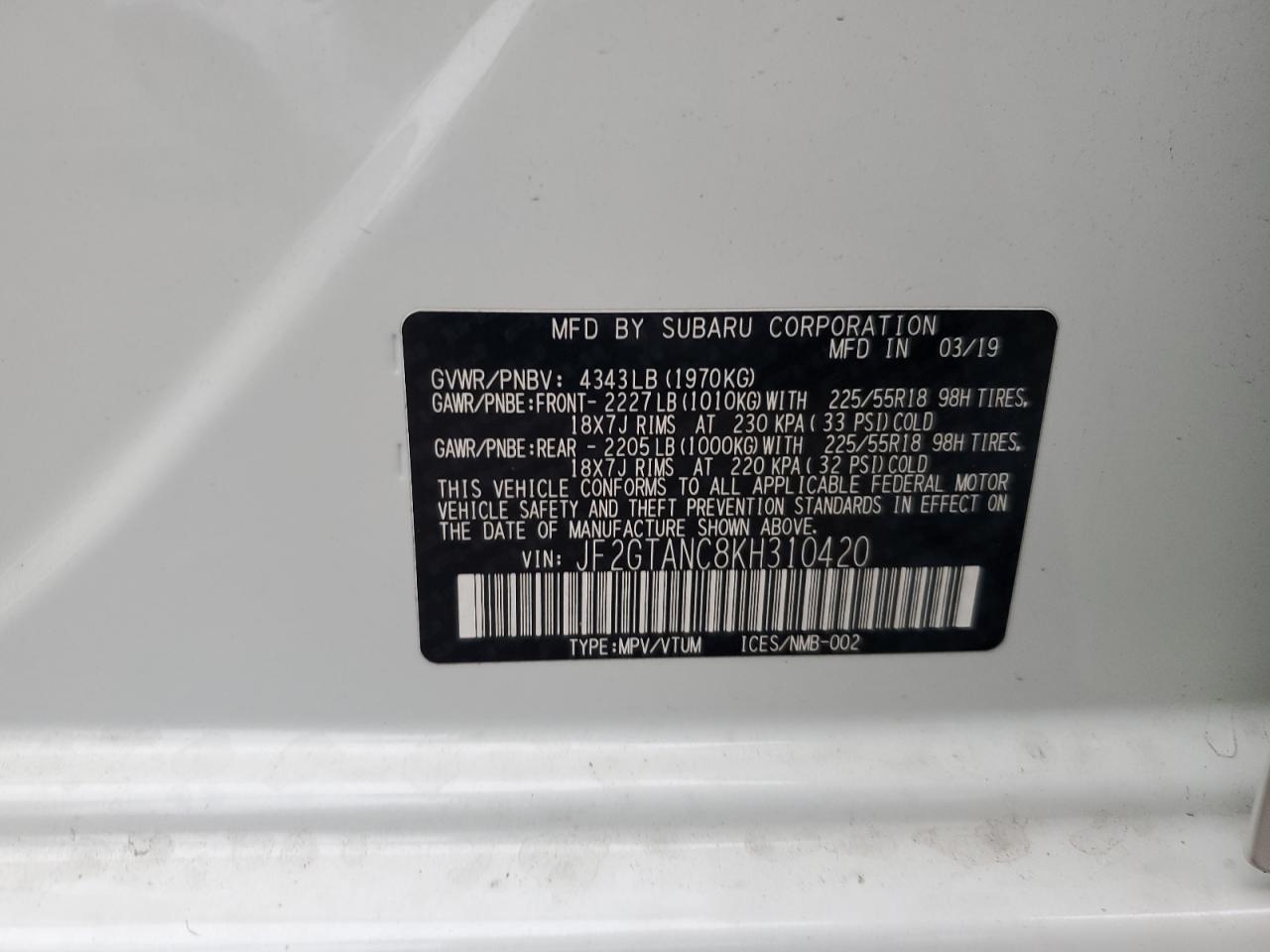 SUBARU CROSSTREK 2.0 2019 р.в., Повний привід (JF2GTANC8KH310420) з США