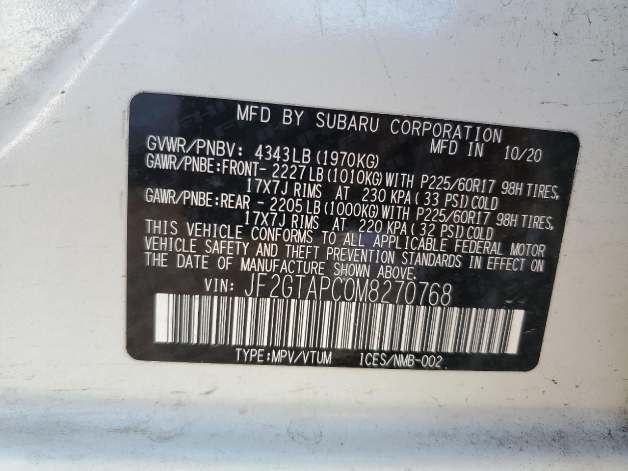 SUBARU CROSSTREK 2.0 2021 р.в., Повний привід (JF2GTAPC0M8270768) з США