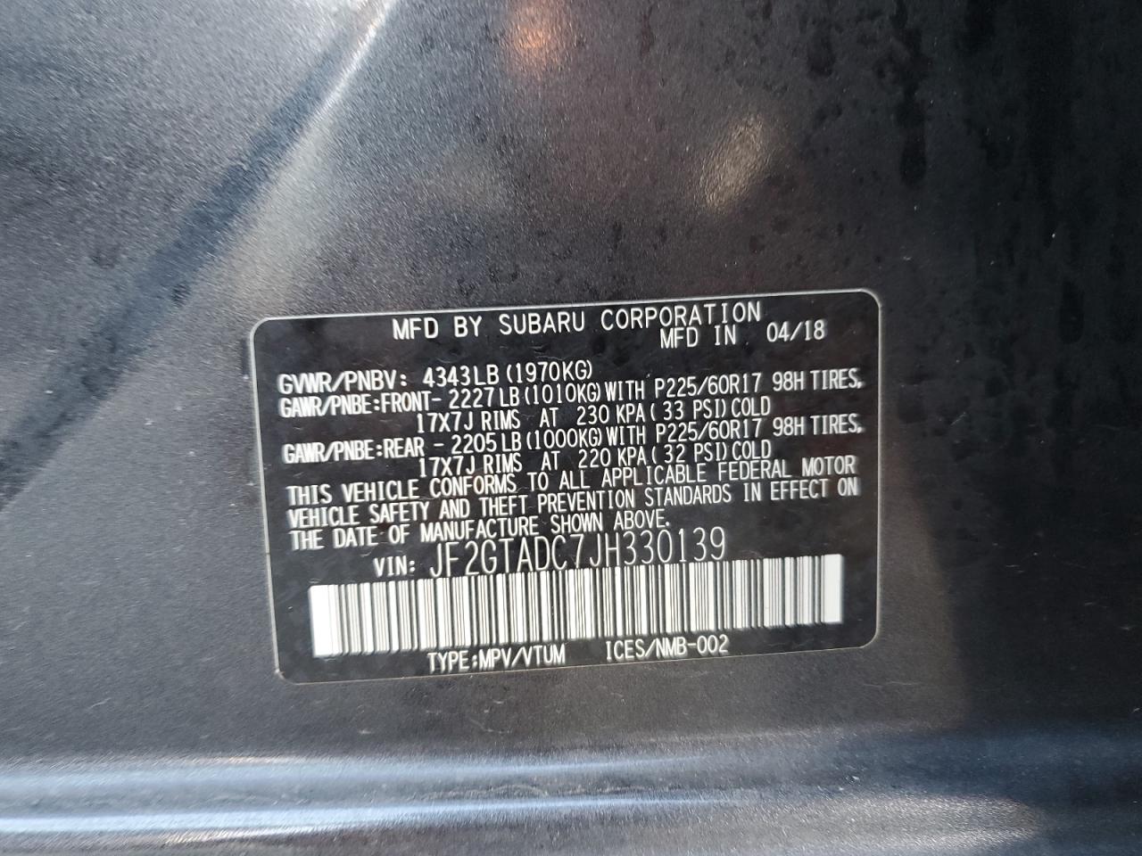 Колір СірийЦиліндри 4Привід Повний привідVIN JF2GTADC7JH330139Стан НевідомоУшкодження ВодаДата аукціону 2025-11-18