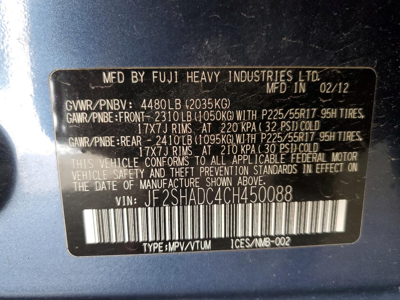 Колір СинійЦиліндри 4Привід Повний привідVIN JF2SHADC4CH450088Стан Заводиться та їде (перевірено)Ушкодження Передня або задня