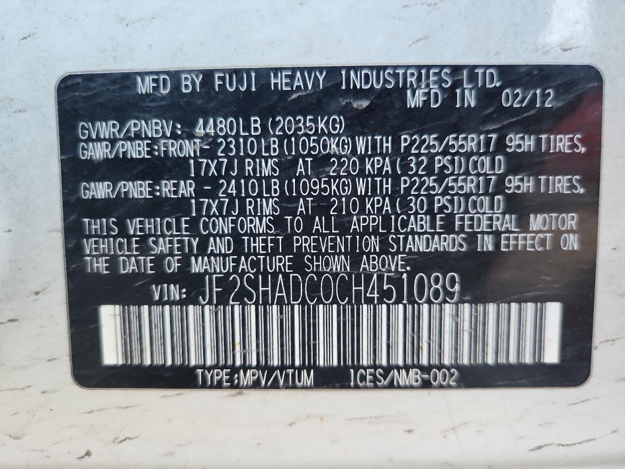 Колір БілийЦиліндри 4Привід Повний привідVIN JF2SHADC0CH451089Стан Заводиться та їде (перевірено)Ушкодження Передня або задня