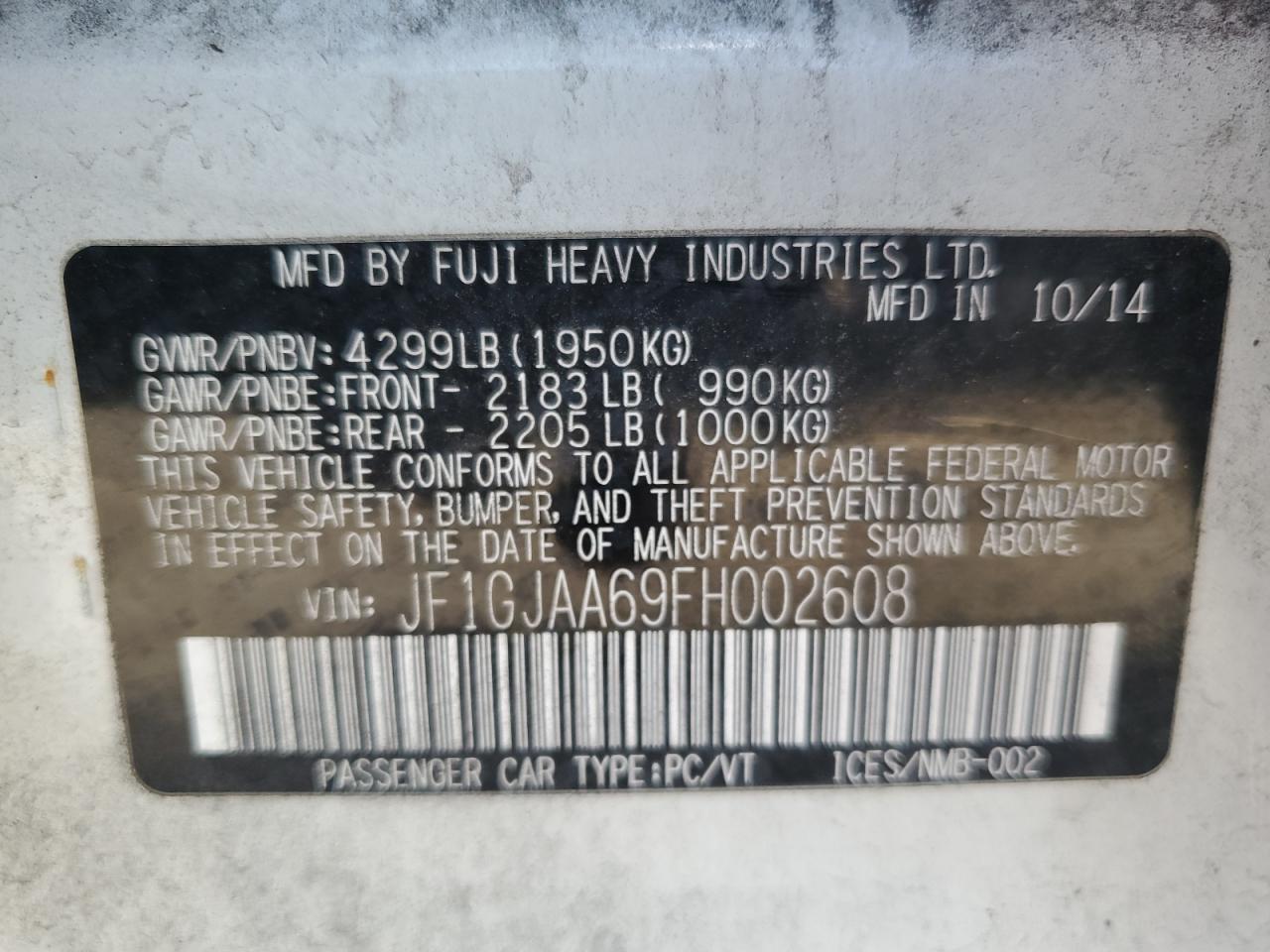 SUBARU IMPREZA 2.0 2015 р.в., Повний привід (JF1GJAA69FH002608) з США