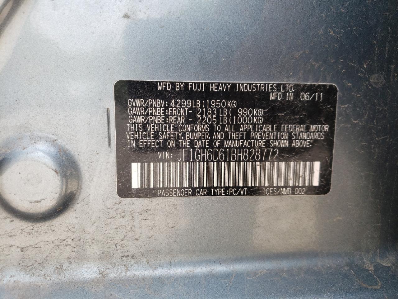 Колір БірюзовийЦиліндри 4Привід Повний привідVIN JF1GH6D61BH828772Стан НевідомоУшкодження З боків