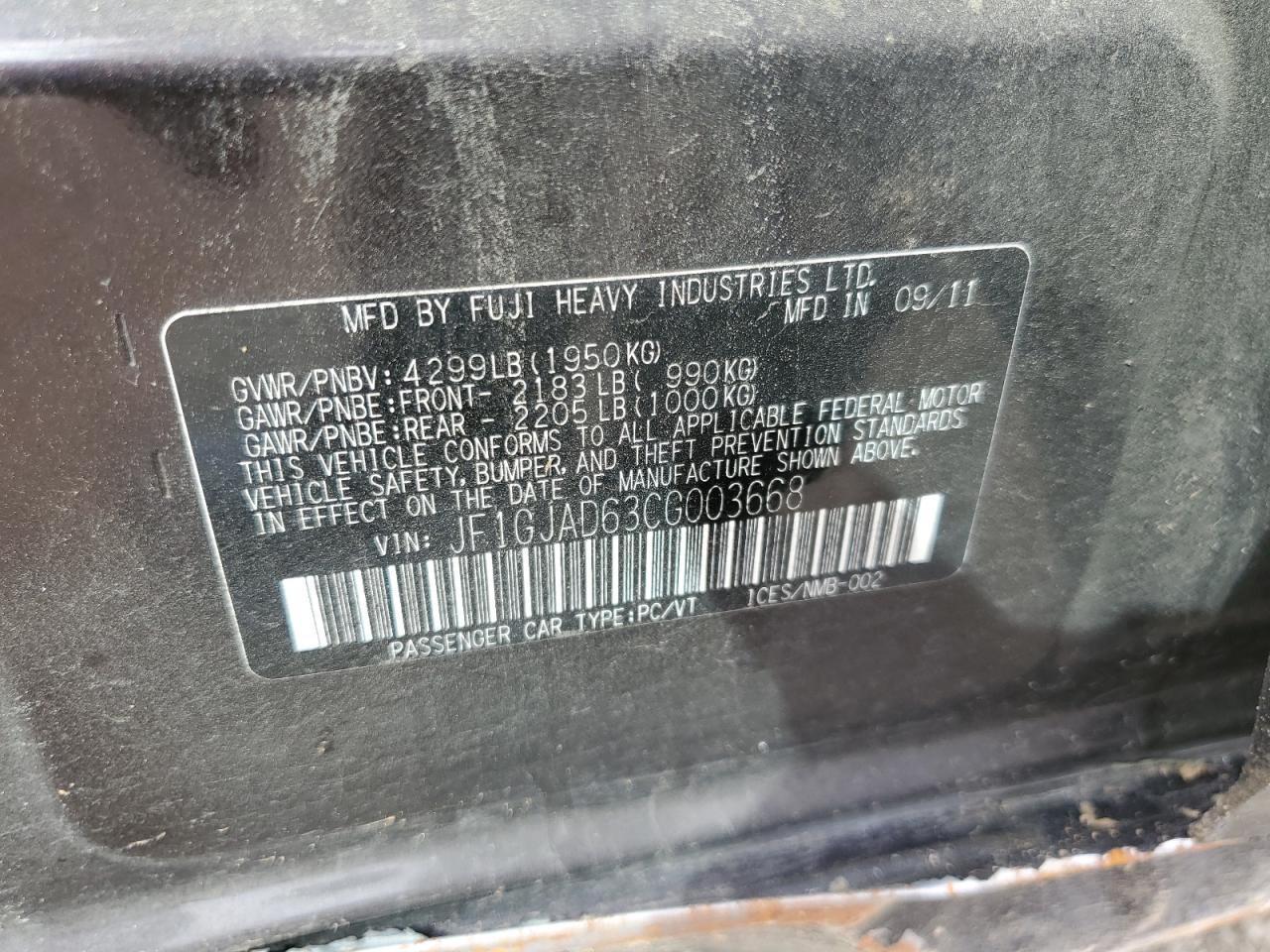 Колір ФіолетовийЦиліндри 4Привід Повний привідVIN JF1GJAD63CG003668Стан Заводиться та їде (перевірено)Ушкодження Передня або задня